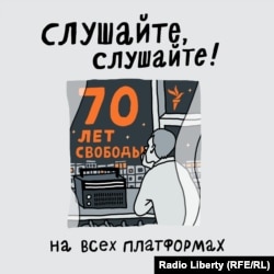 Два года назад, к 70-летию Русской службы, коллеги Иван Толстой и Полина Галуева изготовили прекрасный сезонный подкаст. Чтобы расширить аудиторию, подкаст сопроводили смешным комиксом, который так всем понравился, что серии рисунков, каждая из которых посвящена одному десятилетию "Свободы", мы превратили в большие плакаты и развесили в пражском редакционном коридоре. Теперь мы ежедневно проходим мимо этих огромных страниц собственной славной и поучительной истории.