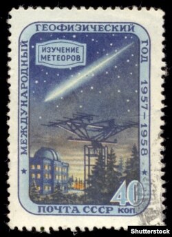 Почтовая марка СССР, 1957 год. Изображено падение Сихотэ-Алинского метеорита. Художник Петр Медведев.