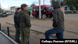 В районном центре села Иволгинск в Бурятии возле Дома культуры с раннего утра непривычно многолюдно. Все обочины, парковки и любые свободные уголки заняты машинами. Мужчин с большими сумками сопровождают жены и дети. Желтые автобусы с надписью "Дети" уходят один за другим. Участок дороги вокруг Дома культуры перекрыт полицейскими машинами с двух сторон. Возле пункта сбора стоит три желтых автобуса и один микроавтобус. Люди столпились вокруг.